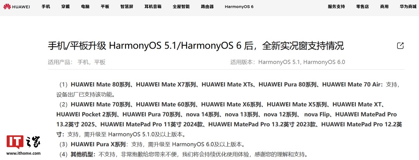 IT之家另附升级 HarmonyOS 5.1 / HarmonyOS 6 后的全新实况窗适配情况: