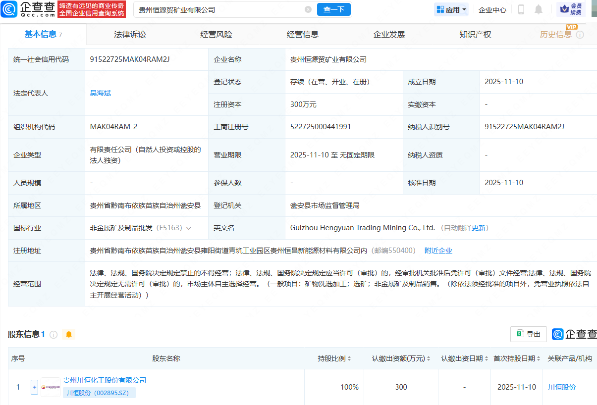 近日,贵州恒源贸矿业有限公司成立,法定代表人为吴海斌,经营范围包含:矿物洗选加工;选矿;非金属矿及制品销售。企查查股权穿透显示,该公司由川恒股份(002895)全资持股。